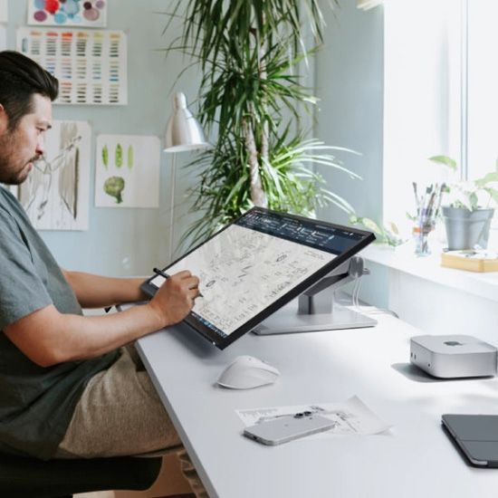 The 27-inch A-LOGIC Clarity Fold Touch monitor combines a 4K display with touchscreen functionality in a flexible design suited to creative and professional use. Its foldable stand allows you to switch from a standard screen position to a tilted or near-flat position for drawing, note-taking or presentations.