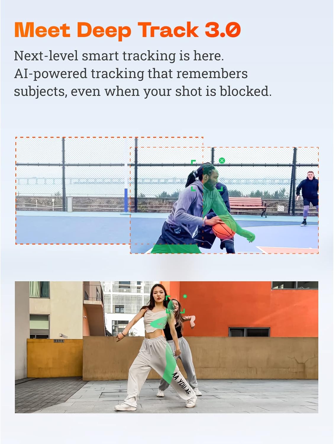 3-axis stabilisation, Deep Track 3.0 AI tracking, built-in pole and tripod.