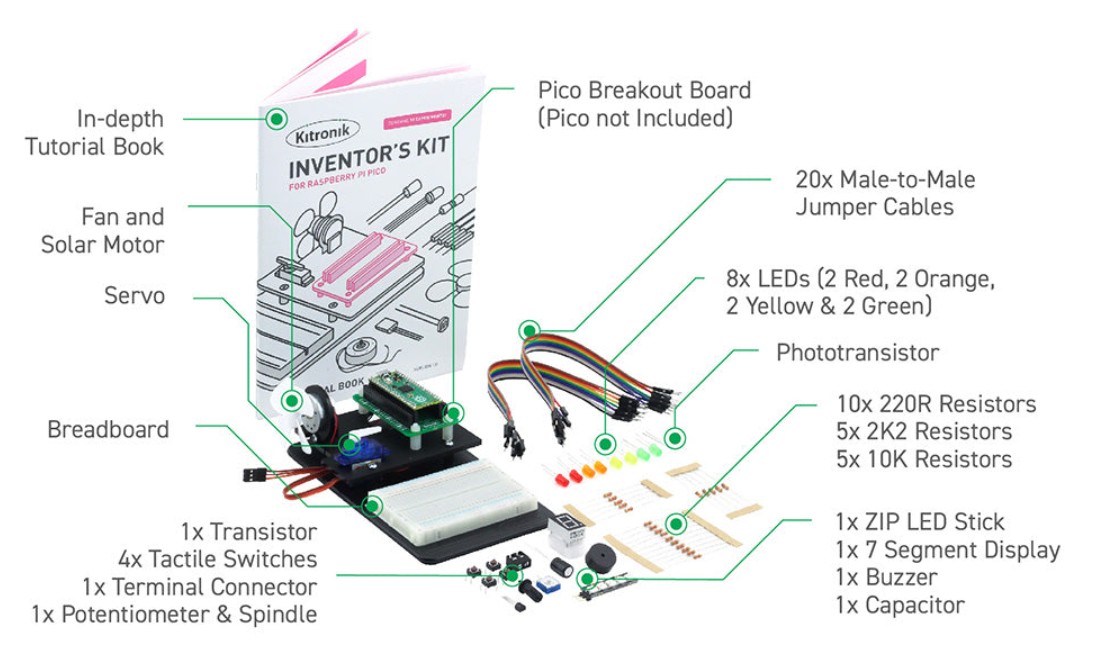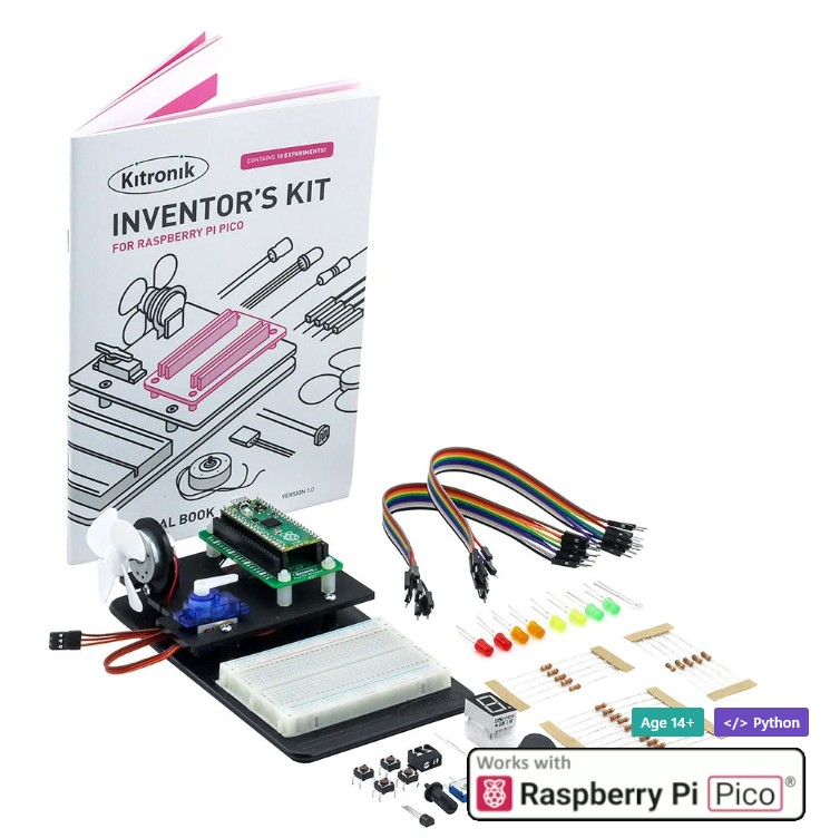 The Kitronik Inventor's Kit for Raspberry Pi Pico is a comprehensive starter kit for electronics and MicroPython programming, designed to teach you by building real circuits. It allows you to gradually understand how sensors, motors and components interact with the Pico board.