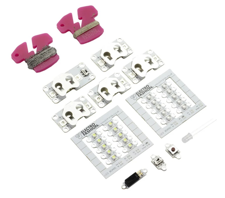The Electro-Fashion Discovery Pack is a comprehensive kit for exploring the world of e-textiles and incorporating light and interactivity into textile designs. It includes a selection of sew-on modules that enable you to quickly create simple or more elaborate lighting projects.