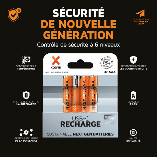 Compact, powerful and environmentally friendly, Xtorm NextGen AAA batteries redefine charging. Thanks to their integrated USB-C port, they can be easily recharged in just 2 hours without an external charger. Designed to last up to 1,500 cycles, they guarantee reliable and consistent power for all your everyday devices.