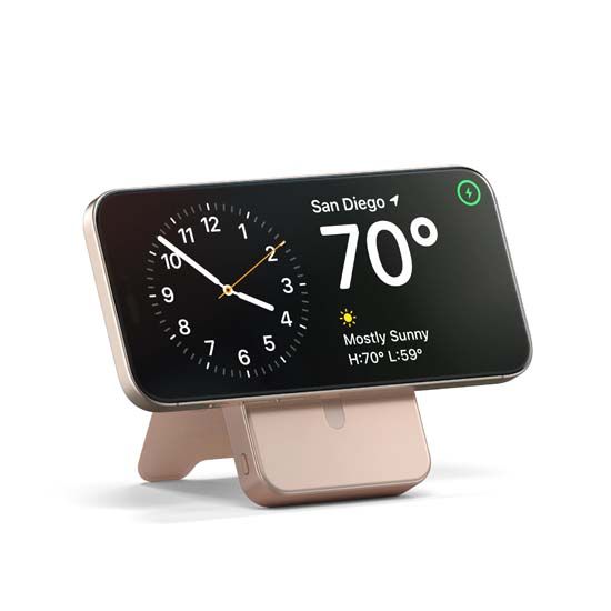 Qi2 15W fast charging, dual output, integrated stand, compact magnetic design, available in black, white or pink.