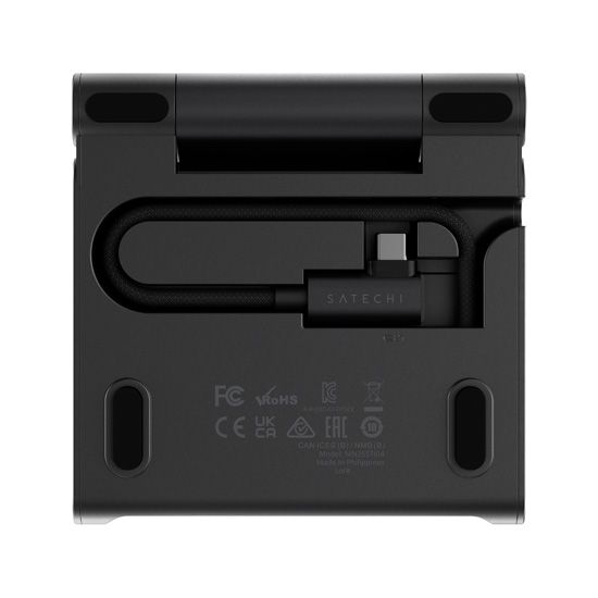 Foldable stand, built-in USB-C hub, HDMI 4K 60Hz, 100W charging, UHS-II SD card readers.