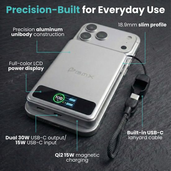 Qi2 15W magnetic battery, USB-C 30W, colour LCD screen, integrated 60W cable, secure flight mode, TSA compliant.