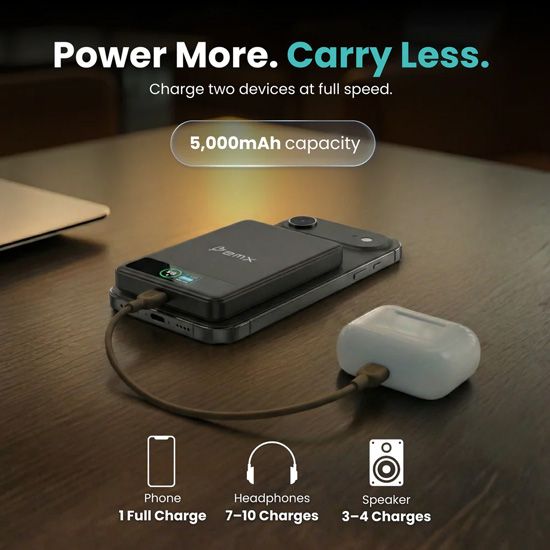Qi2 15W magnetic battery, USB-C 20W, colour LCD screen, integrated 60W cable, secure flight mode, TSA compliant.