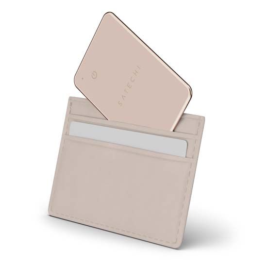 Technologie Apple Find My, recharge sans fil, aluminium et verre trempé, résistance IP66, design carte de crédit, disponible en noir, rose ou blanc.