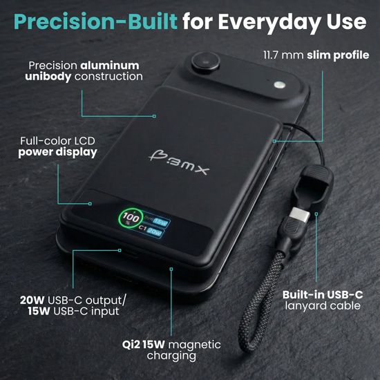 Batterie magnétique Qi2 15W, USB-C 20W, écran LCD couleur, câble intégré 60W, mode avion sécurisé, conforme TSA.