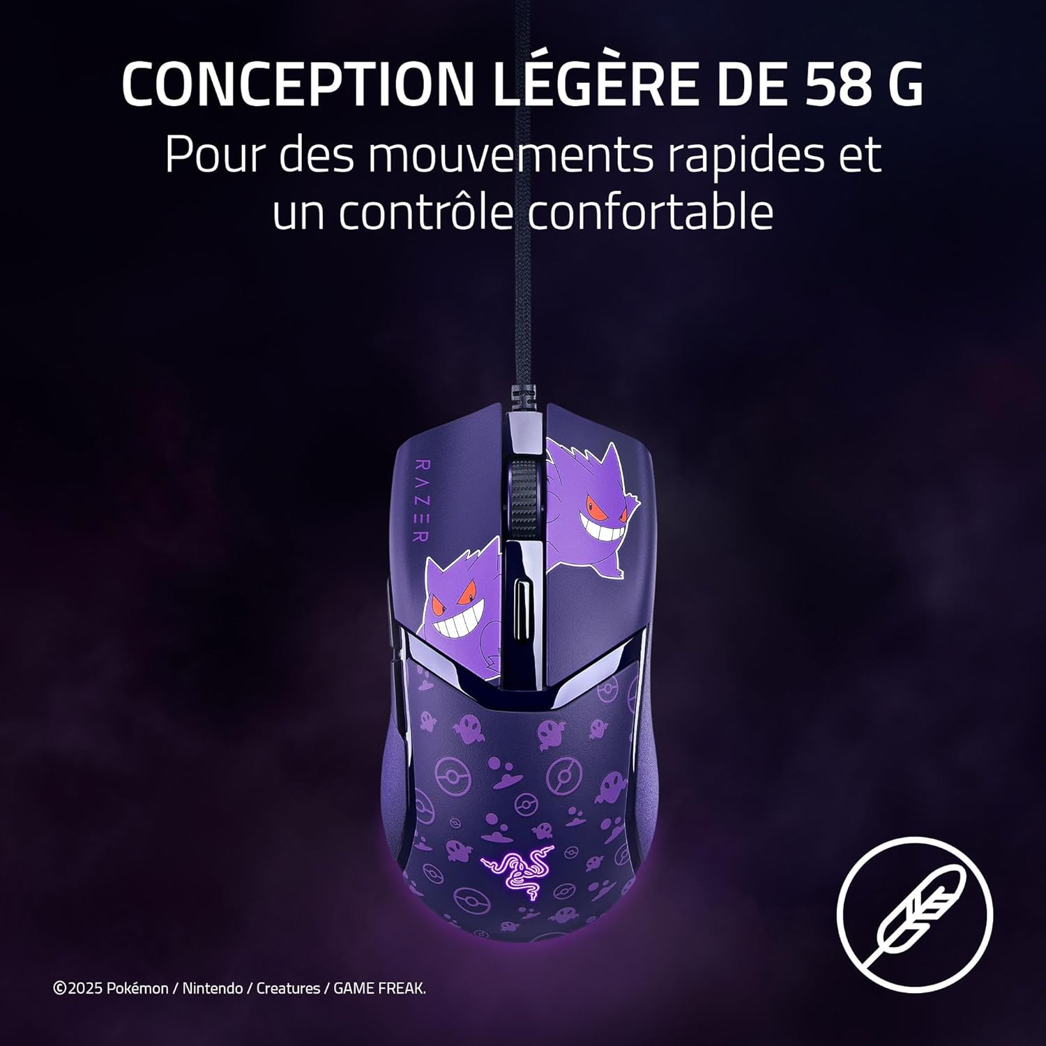 Design Pokémon Gengar, souris ultralégère 58 g, capteur 8500 DPI, switches optiques Gen-3, éclairage Chroma RGB.