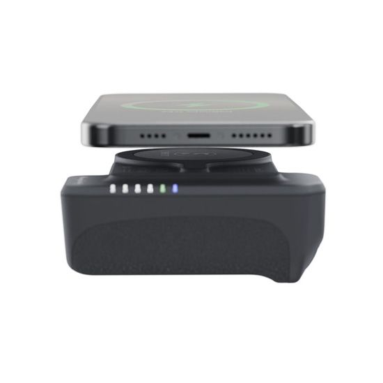 Grip batterie pour créateurs, charge sans fil Qi2 rapide, ergonomie type appareil photo, montage magnétique instantané, format compact et puissant.