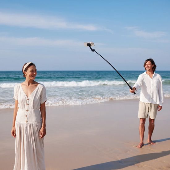 Trépied et perche à selfie pour créateurs, hauteur maximale 180 cm, structure aluminium stable, montage magnétique rapide, télécommande Bluetooth incluse.